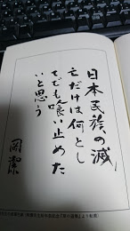 で、その本冒頭には『日本民族の滅亡だけは何としても喰い止めたいと思う』という直筆サイン入りの色紙に、先生の風貌。。。。。。まるで〇〇ですわね笑